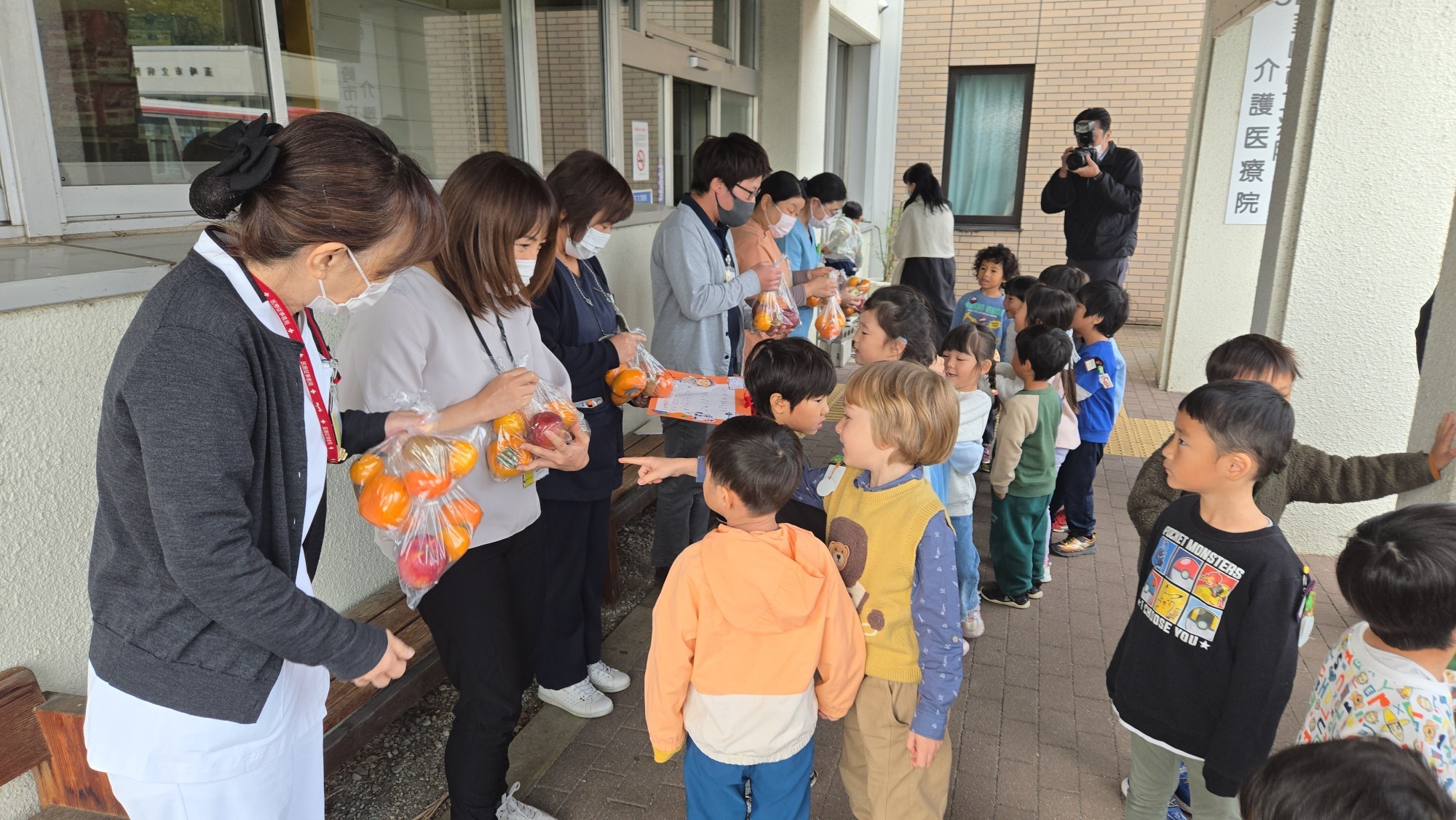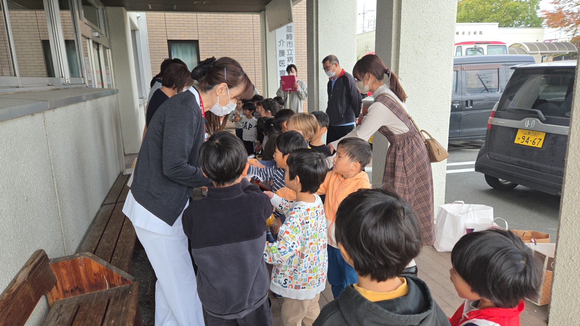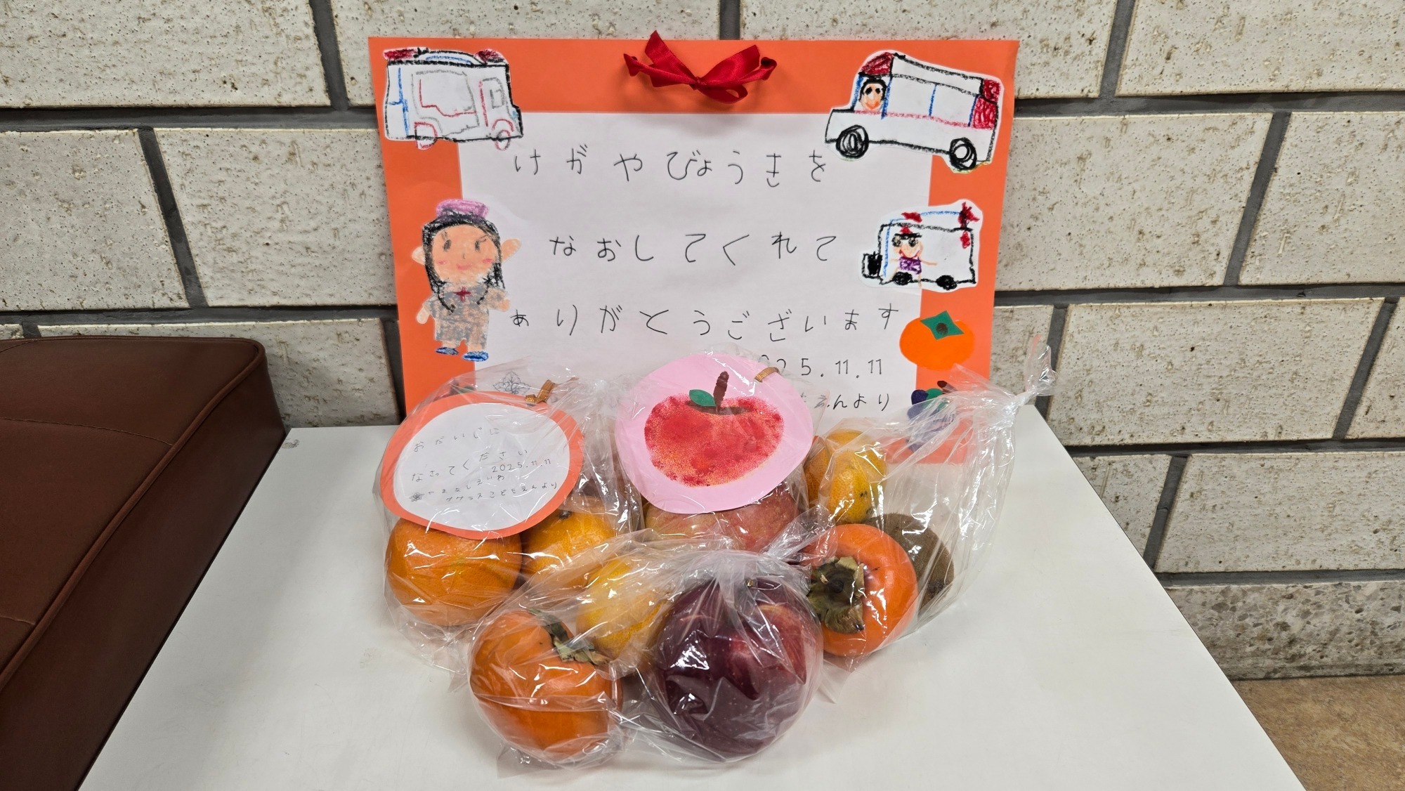 11月11日(火)、山梨英和ダグラスこども園の園児が来院されました。素敵な笑顔とともに歌の披露や、秋の味覚とメッセージカードをいただき、入院患者だけでなく当院職員も幸せに包まれました。いただいたメッセージカードは、院内に飾らせていただきますので、当院にお越しの際には、ぜひご覧ください。