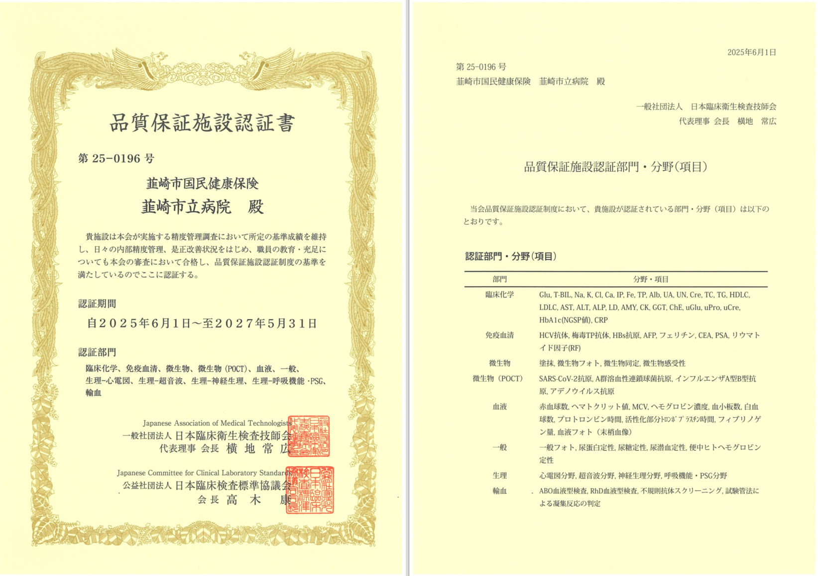品質保証施設の認証は、臨床検査業務における精度の向上、スタッフの専門性の向上、そして医療の信頼性確保に繋がる重要なステップです。今後も、より安全で正確な医療を提供するために、検査部門の品質向上に引き続き努めてまいります。